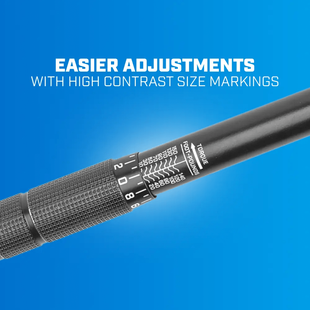 HART 1/2" TORQUE WRENCH - an essential tool designed to provide accurate torque readings every time. Engineered for precision and convenience, this tool is ideal for a variety of tasks from automotive work to home repairs. With its pre-calibrated accuracy of +/- 4%, this wrench provides reliable readings even after repeated use. You can forget about tedious adjustments with this wrench - just select your required torque level on any bolt size thanks to the high-contrast size markings. With a wide torque range from 10-150 ft-lbs., you have everything you need in one handy package. And when you're done, keep your wrench safe and secure in the included tool case to protect & prolong its accuracy, perfect for storage or traveling between job sites. We stand behind our product quality and reliability, so you never have to worry. Enjoy peace of mind with the included Limited Lifetime Warranty to ensure your work is always done right!