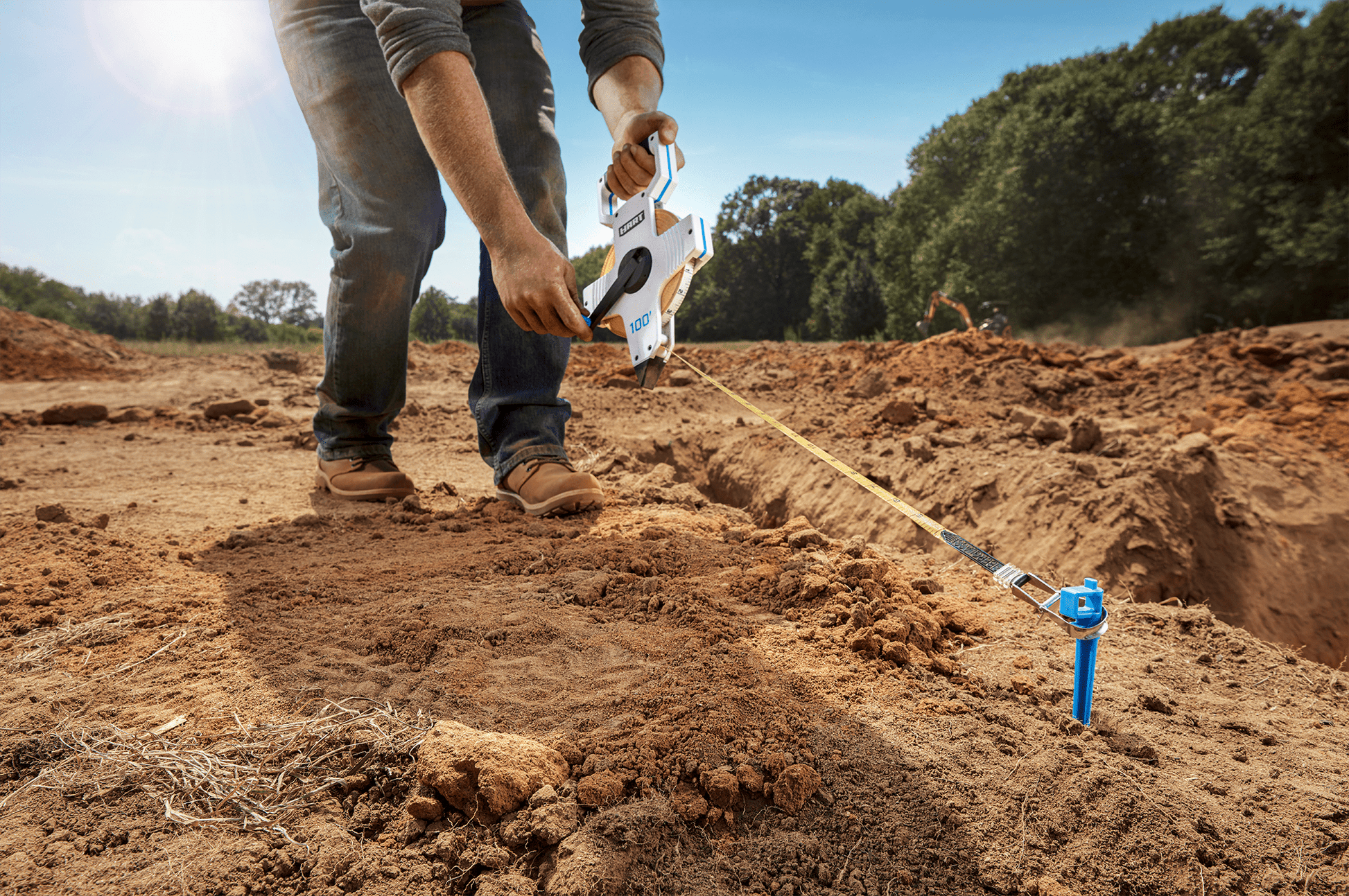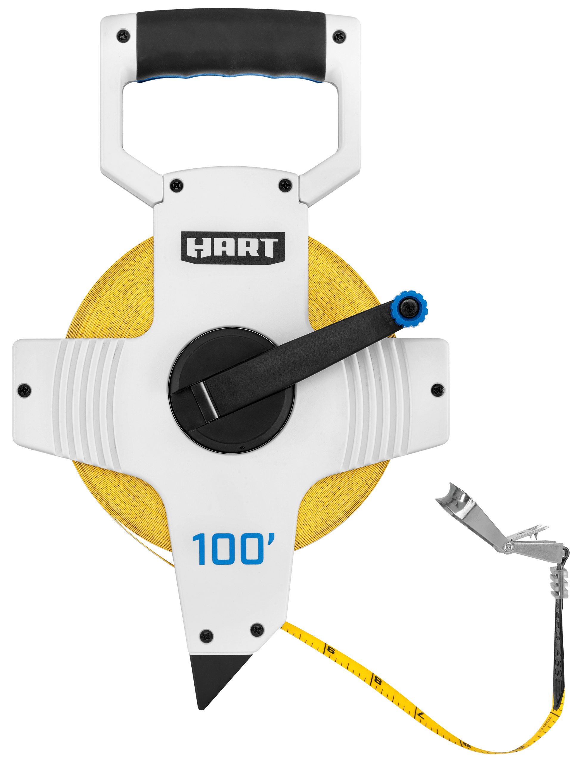 HART’s 100’ Open Reel Long Tape Measure offers you the ability to measure far and wide with a detachable grounded stake essential for single-person readings. Constructed from durable fiberglass, the blade withstands various terrains. The metal-ended loop easily hooks on to secure posts for versatile anchoring where needed. Includes ground stake.