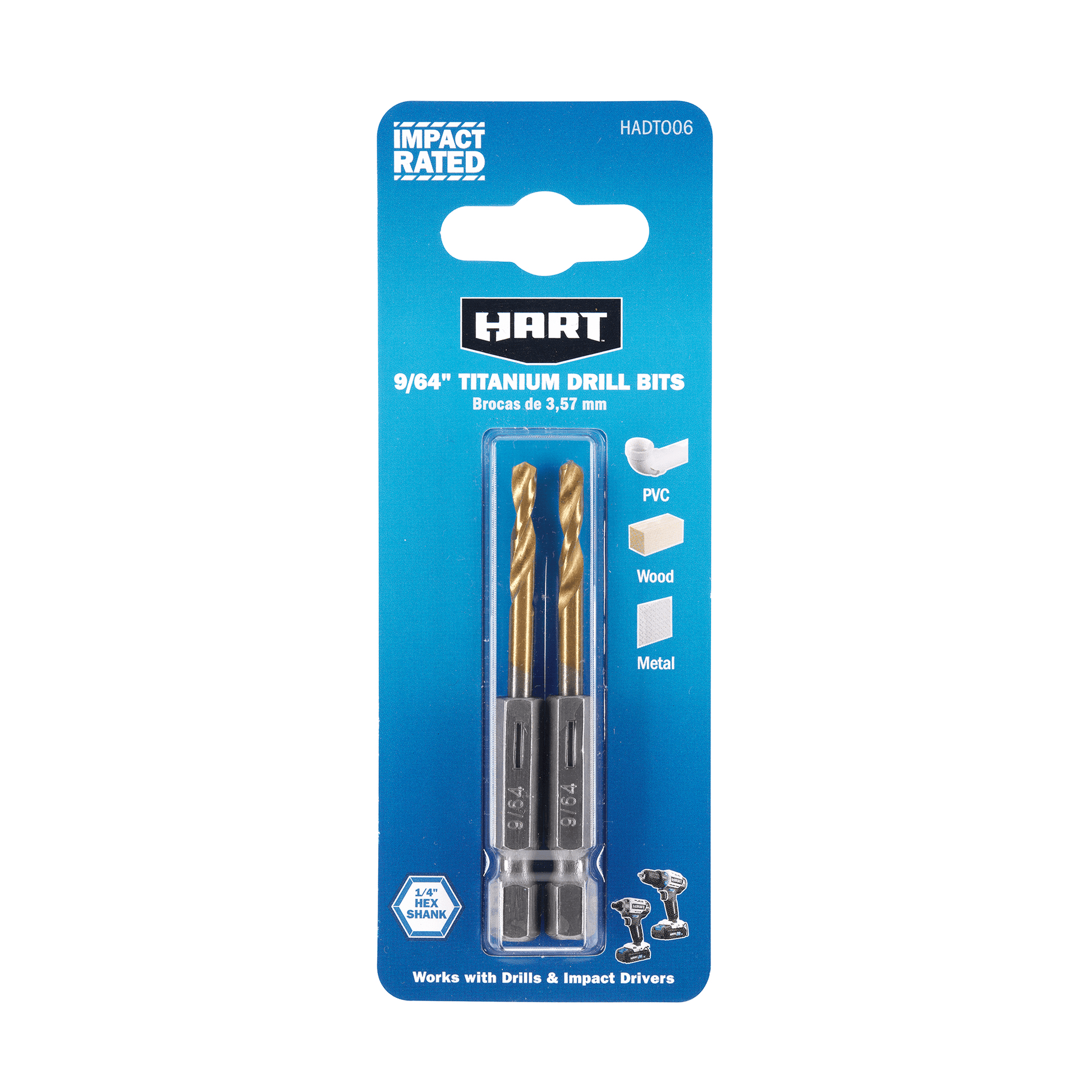 The HART 9/64” Titanium Drill Bits are perfect for drilling applications through wood, metal, and PVC. The 135° split point tip prevents the bit from walking for an easier start. The titanium coating reduces friction and heat, giving your HART drill bits longer life. These bits feature a ¼” hex shank for superior holding power and quick bit changes. With the ¼” hex shank feature and being impact rated, you have the versatility to use in your drill and impact driver!