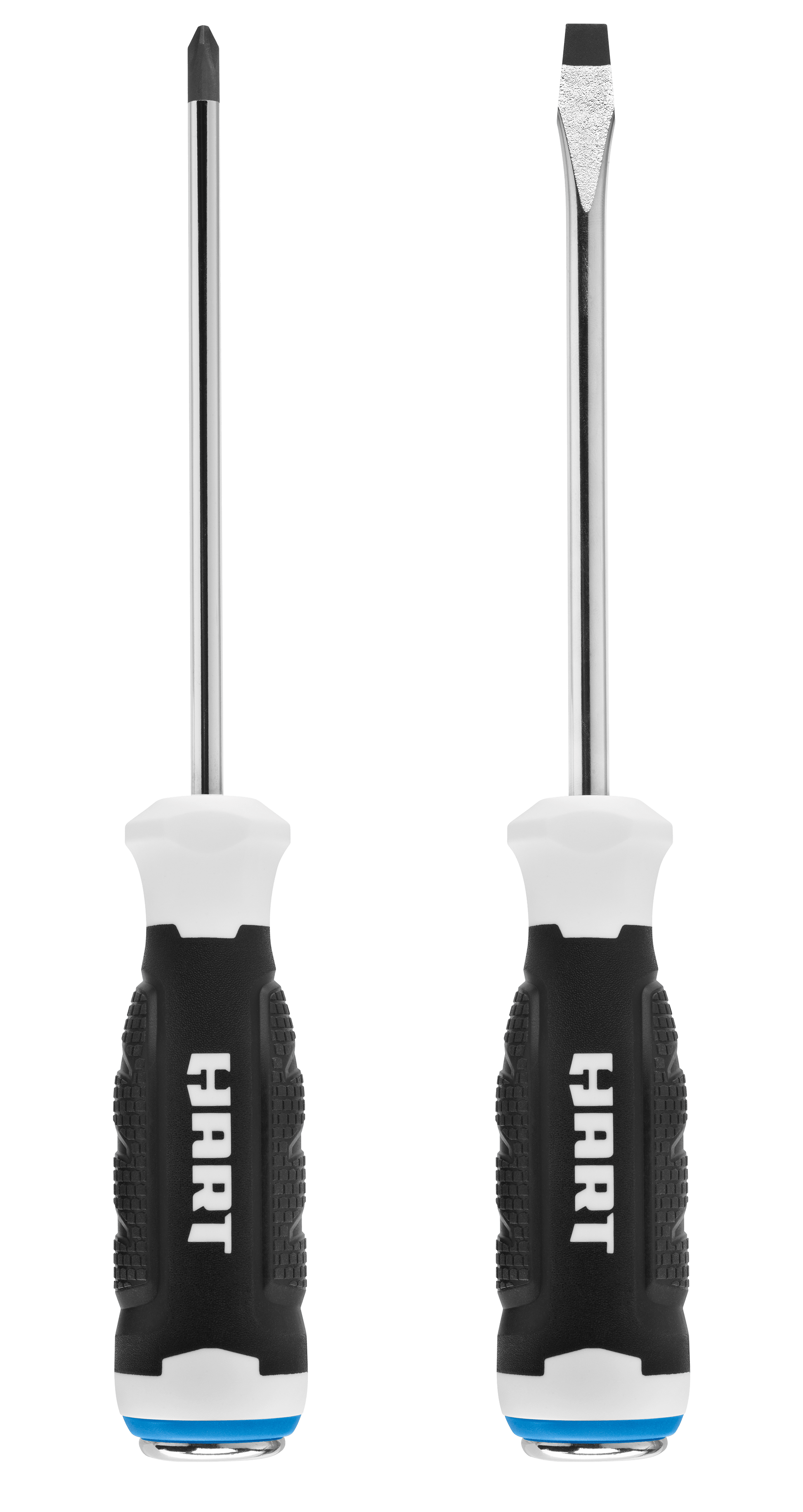 Your hand tools should be as reliable and hardworking as you are. HART’s 2 PC. Demolition Screwdriver Set is super robust and designed for heavy use and abuse. The set includes two demo screwdrivers, one a Phillips, and the other a slotted head. With an all-metal core and steel end cap, these screwdrivers are designed to take abuse, such as hitting it with a hammer. The way the screwdrivers work is the all-metal core transfers the force directly from the end cap to the tip. The end caps also feature a quick identifier, so you know which screwdriver you’re grabbing. They also come with magnetic tips for a better hold on fasteners. The comfort grip handle, not only feels good in your hand, but it’s also a better way to apply leverage. And because it’s made by HART, you’re covered by a limited lifetime warranty. In general, HART demo screwdrivers will last you a long time, even under heavy use.