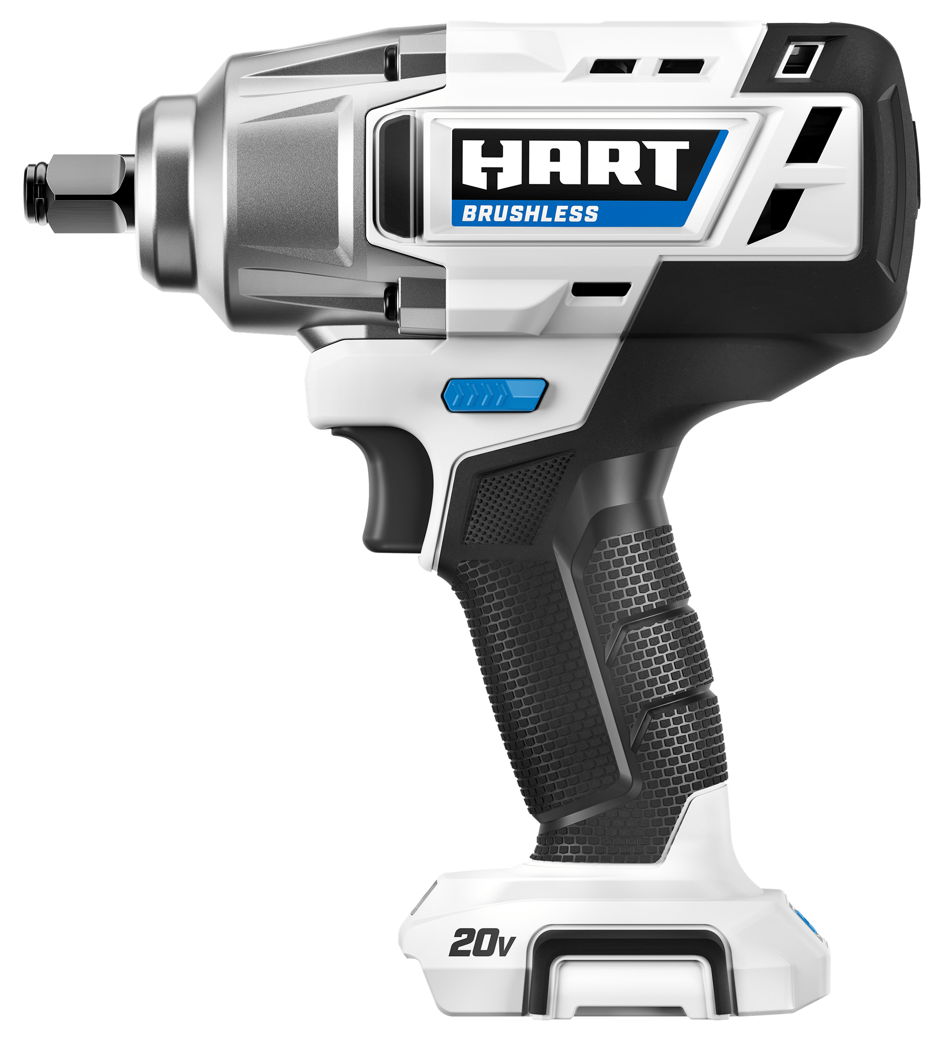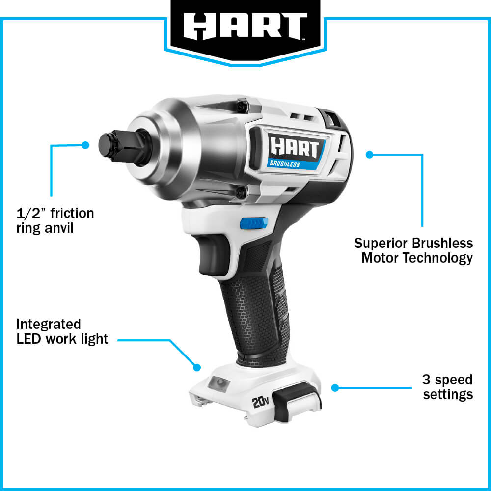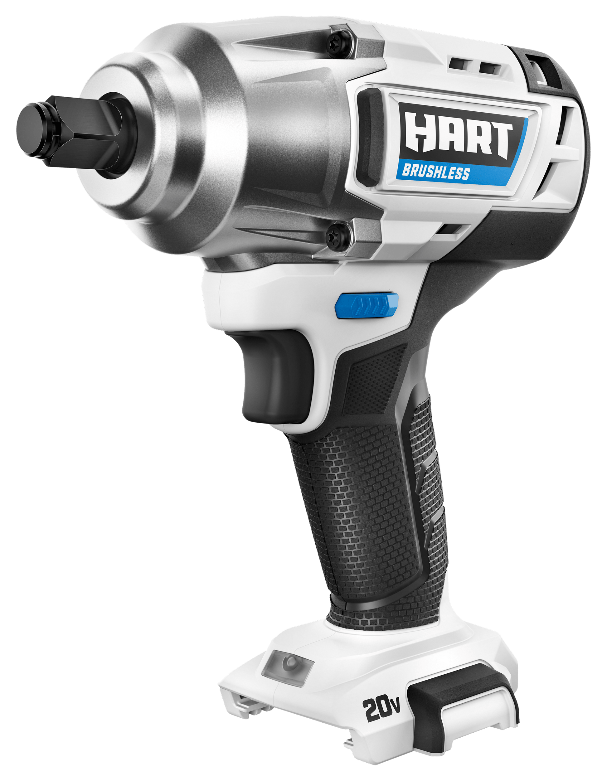 When you need some serious torque, reach for the HART 20V 1/2" Brushless Impact Wrench. This powerful tool delivers up to 70% more torque than conventional brushed motors, with up to 600 ft-lbs of breakaway torque. With Brushless Superior Motor Technology, you'll get more power, longer runtime, and longer motor life. The 3 speed settings give you increased control in a variety of applications, while the integrated LED work light ensures increased visibility. Quick socket changes are a breeze with the ½” friction ring anvil, and it works with all HART 20V batteries. Includes: (1) 20V ½” Brushless Impact Wrench and Operator’s Manual. Battery and charger sold separately.