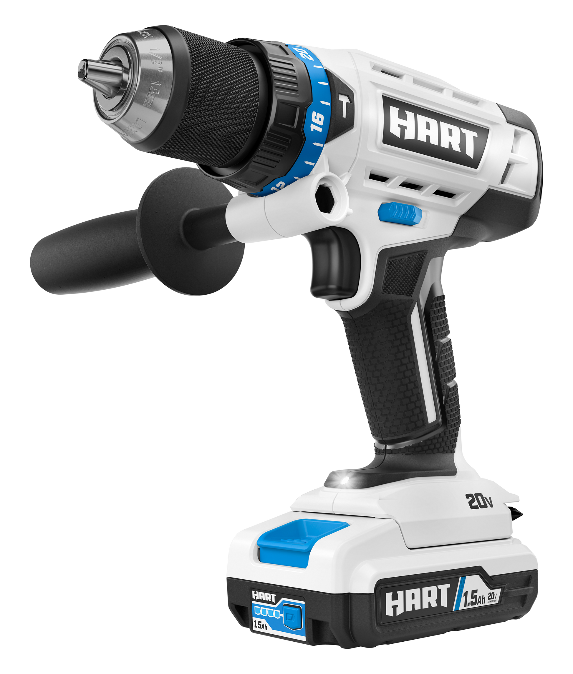 HART’s 20V 1/2” Cordless Hammer Drill provides the power, durability, and versatility to handle all of your drilling applications. Its powerful motor delivers up to 24,000 BPM for drilling through brick, mortar, and concrete. The 1/2” heavy-duty metal chuck provides increased durability, while the auxiliary handle ensures you’ve always got a secure grip during high torque applications. The drill also features a 24-position clutch for adjusting torque while driving fasteners for ultimate control. It also includes an integrated LED work light to enhance visibility and onboard bit storage for user convenience.