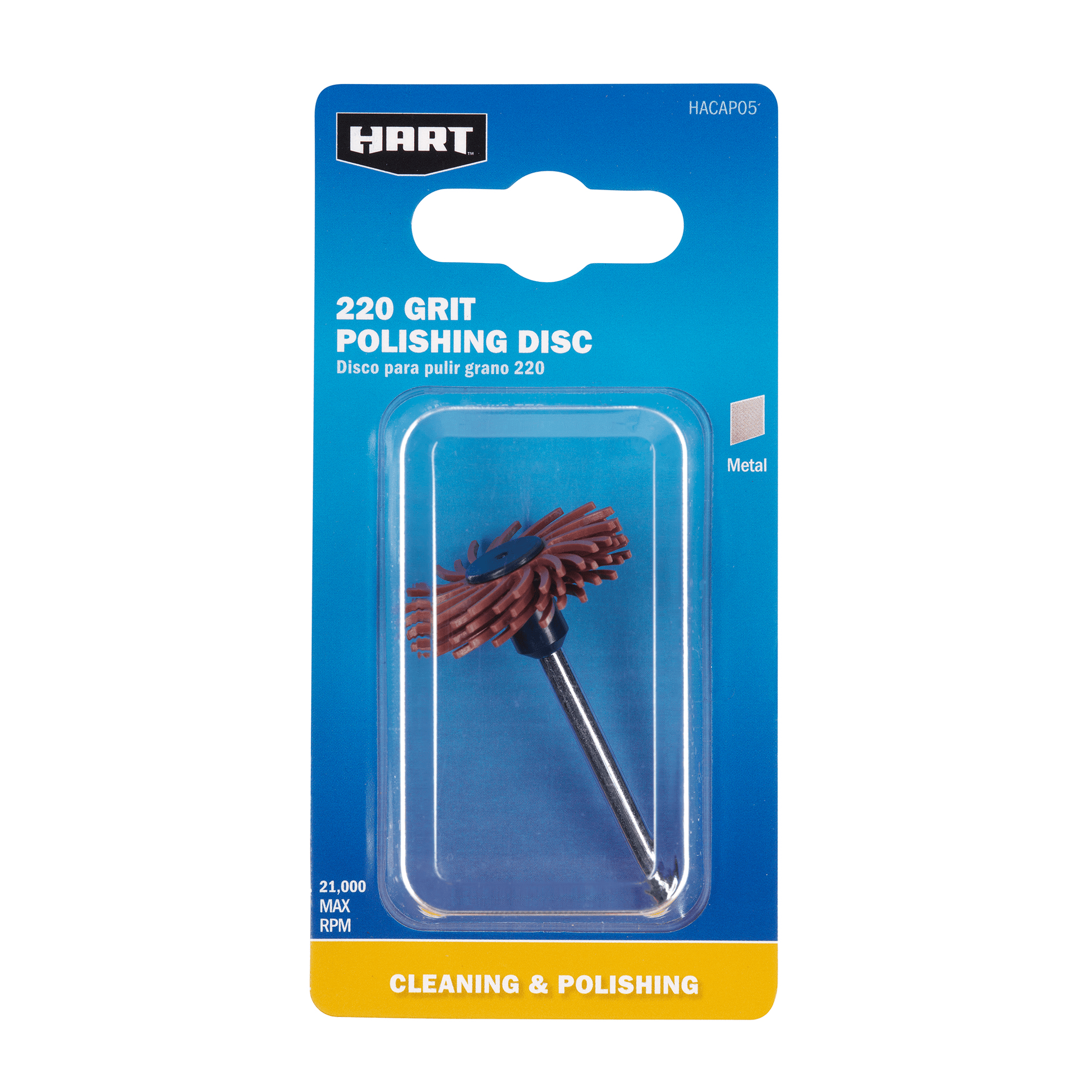The HART 220 Grit Polishing Disc is the perfect tool for giving metal surfaces a smooth, polished finish. Polishing is now easier than ever because no polishing compound is needed with this disc. With a 21,000 Max RPM and a 1/8” Shank, this disc is designed for use with rotary tools to quickly and easily polish metal surfaces. Try out the HART 220 Grit Polishing Disc on your next rotary project!
