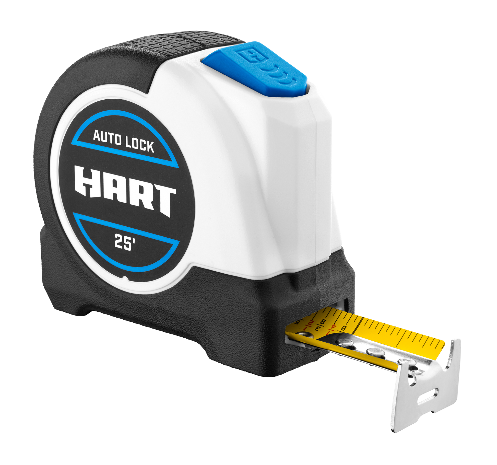 HART’s 25’ Auto-Lock Tape Measure features seven-foot standout, rubber overmold for a better grip and impact resistance, an oversized hook design that grabs from top and bottom and fraction markings for quick and accurate reads. The automatic blade stop button helps control blade retraction and the wire form clip reduces belt/pocket fraying.
