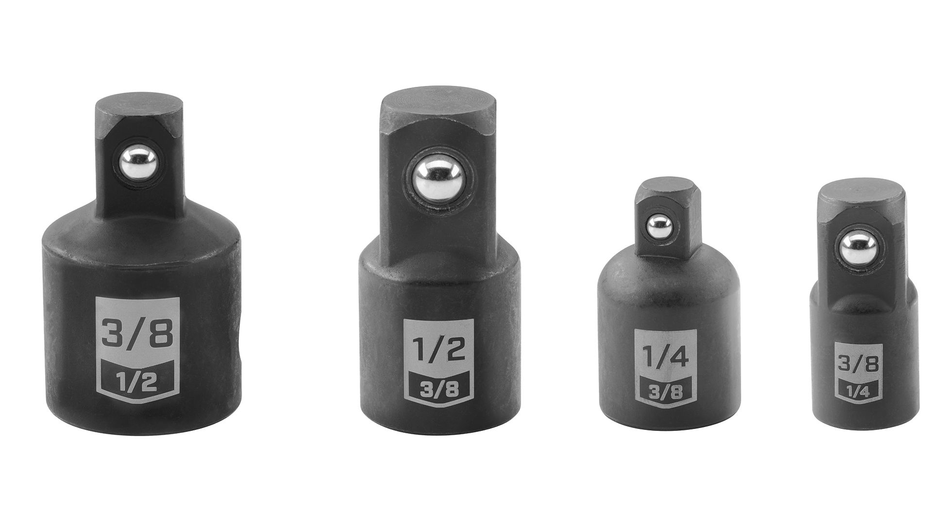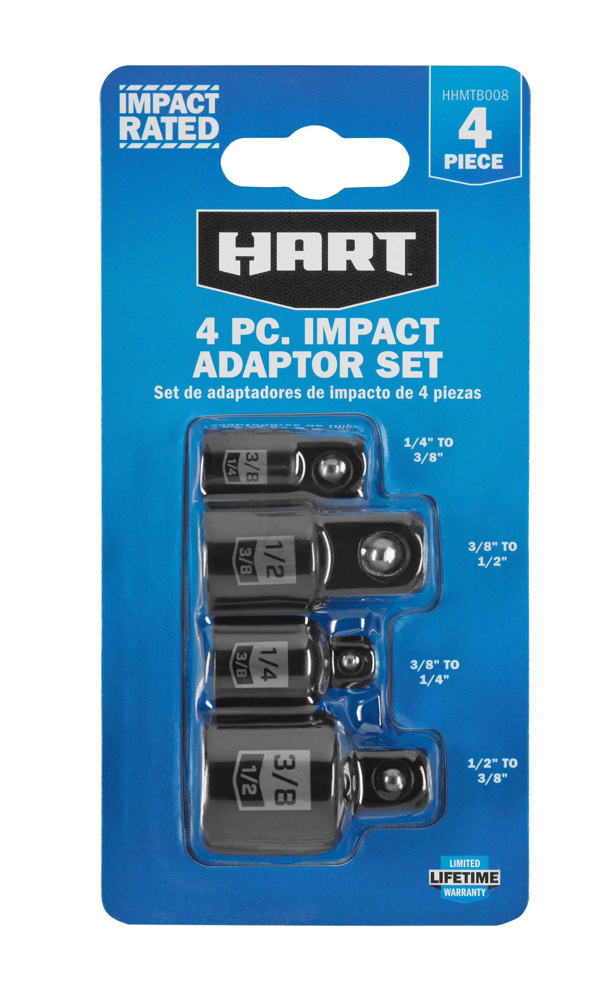 HART’s 4 Pc. Impact Adapter Set is made from impact-rated CRV steel. These adapters offer superior strength during high torque applications. Set includes (1) 1/4" to 3/8” drive square adapter; (1) 3/8" to 1/2" drive square adapter, (1) 3/8" to 1/4” drive square adapter and (1) 1/2"x 3/8” drive square adapter.