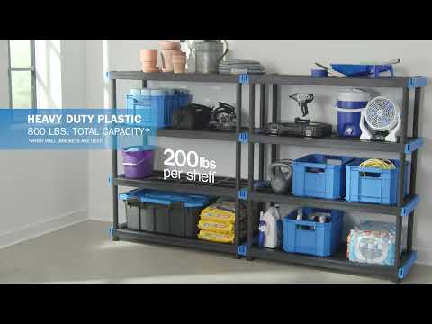HART 4-Tier Heavy-Duty 20"x 48" Interlocking Plastic Shelving Unit offers additional storage space for your utility room, pantry, garage, outdoors or for closets. This unit has a total capacity of 800 lbs. Featuring 4 ventilated shelves that helps distribute up to 200 lbs. per shelf equally, while providing air circulation to keep away mildew. Made from durable black resin designed to resist rust, dents, stains and peeling. Non-adjustable shelves for extra stability to support a variety of items from cans, cleaning supplies, tools, hardware, totes, and more which makes it perfect for maximizing space inside the home or garage. Allows for multiple units to be connected and interlocks for a custom shelving solution designed to fit your space.