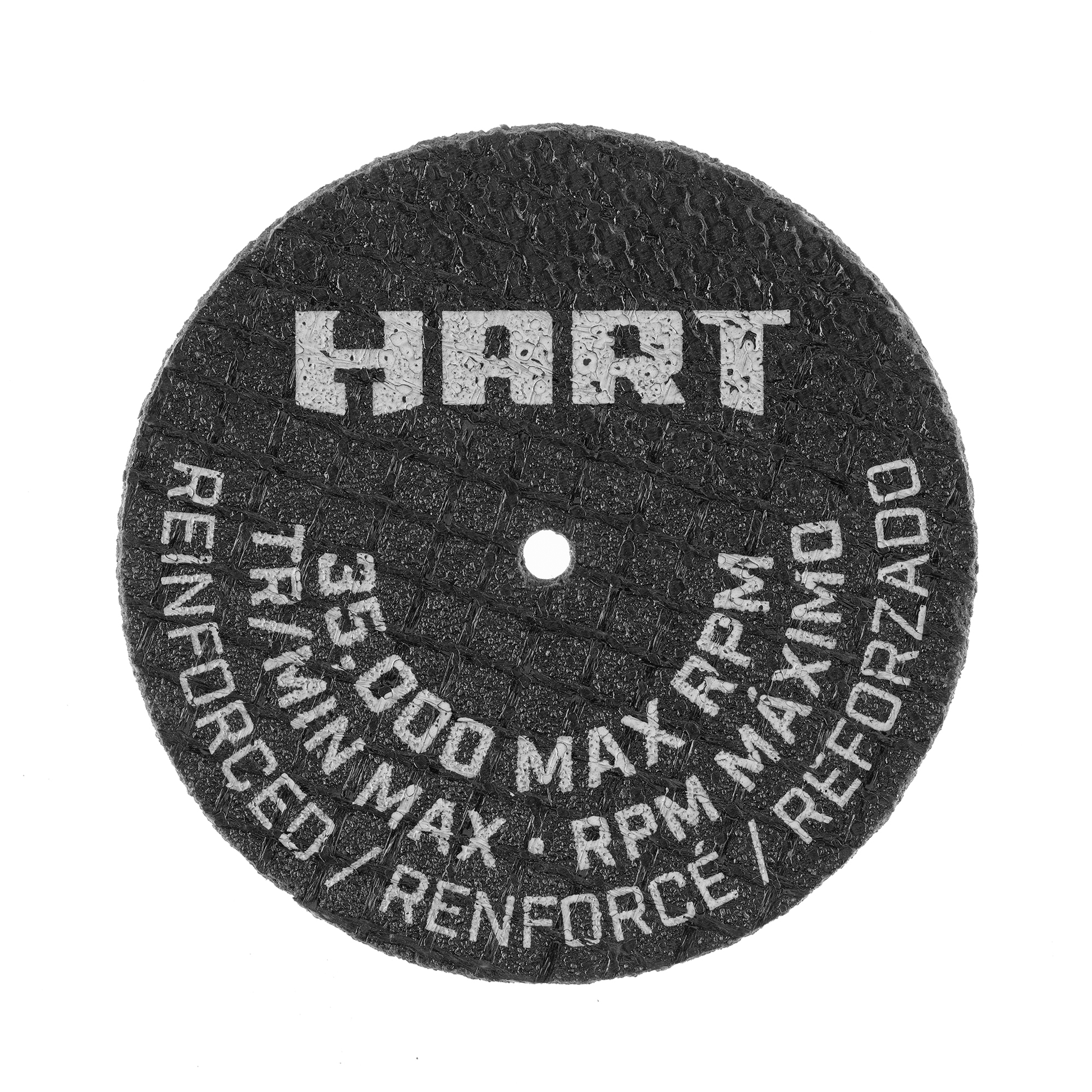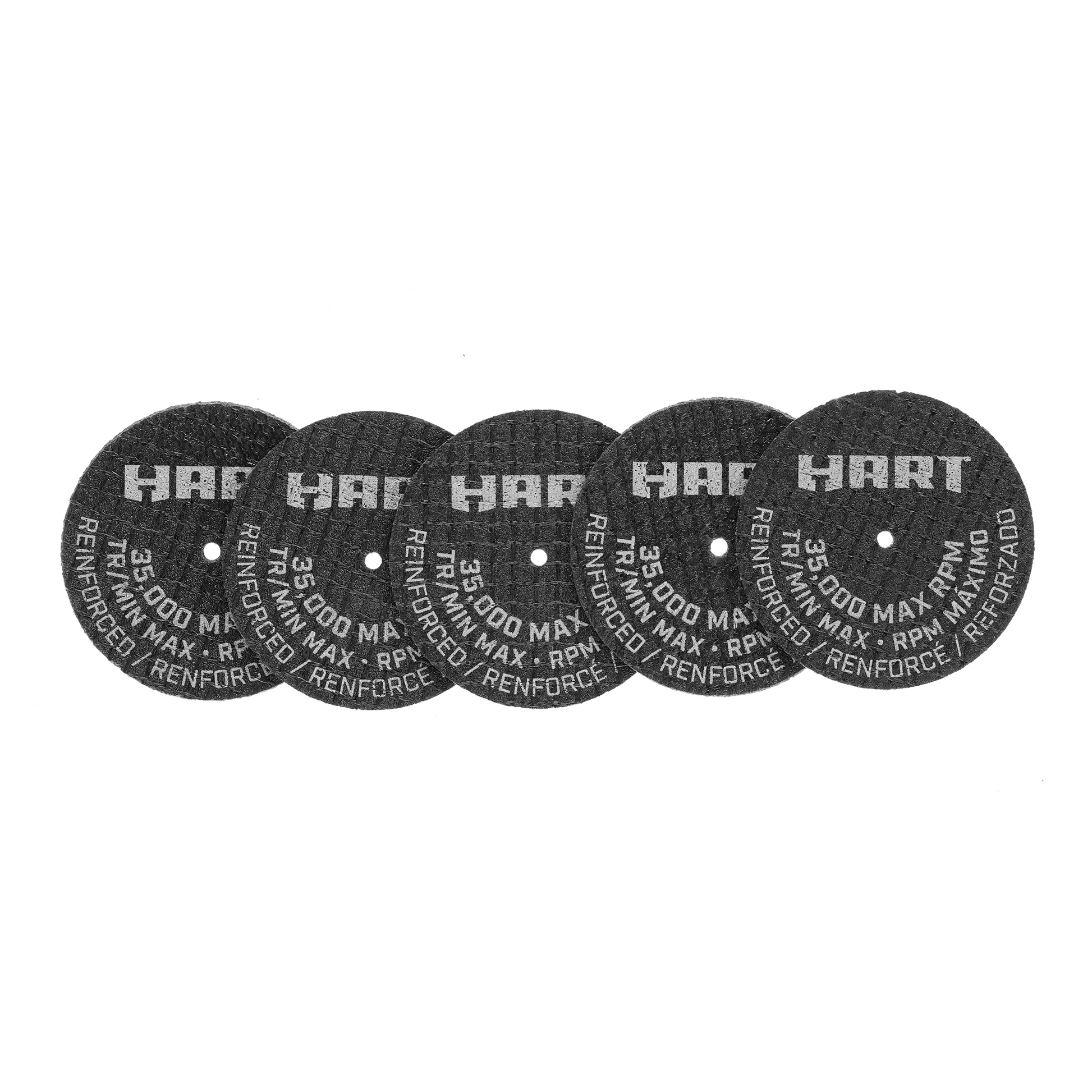 The HART 5 PC. 1-1/2" Reinforced Cut-Off Wheels are perfect for any DIYer or Hobbyist. With a max RPM of 35,000, these wheels can quickly and easily cut through both metal and plastic. Reinforced wheels are bonded by a mesh center which extends the life of the wheel. They are also compatible with most rotary tools, making them a versatile and essential addition to any accessory kit. This set includes (5) 1-1/2" Reinforced Cut-Off Wheels.