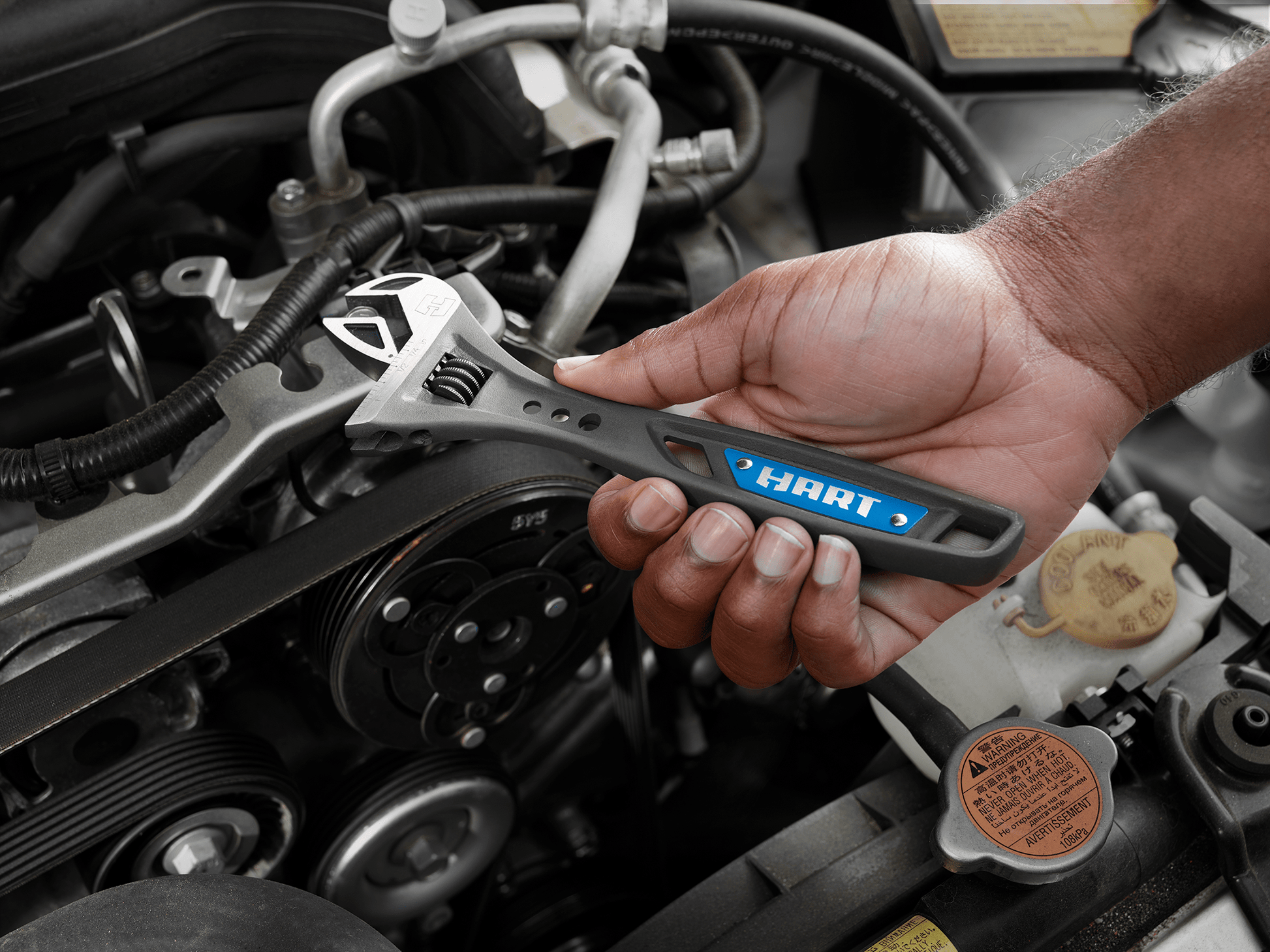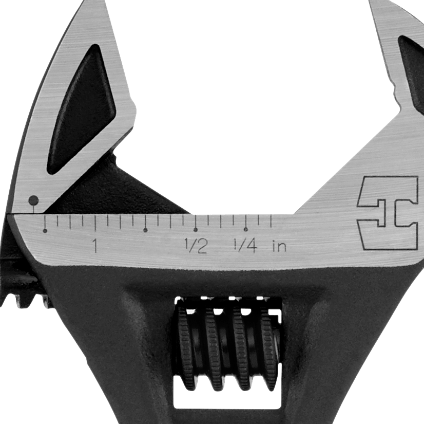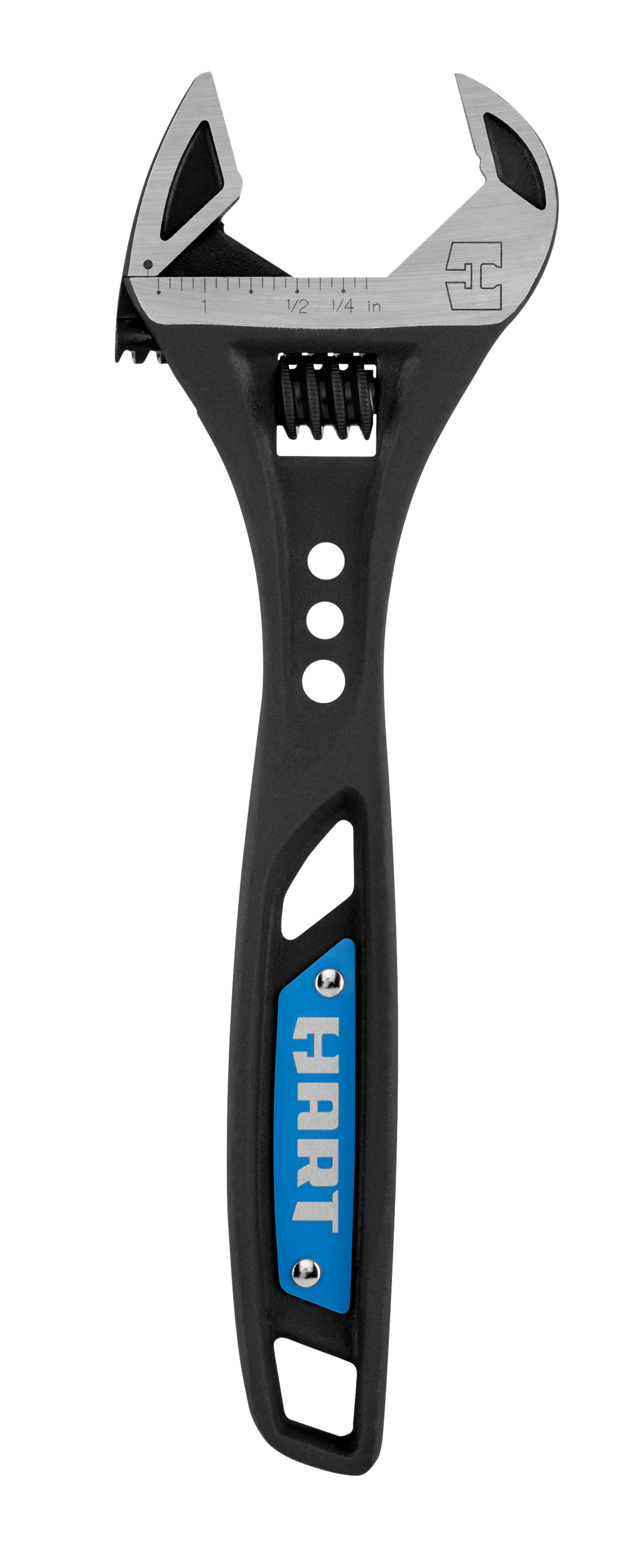 HART’s 8" Pro Adjustable Wrench features up to 25%* wider jaw opening for greater capacity. Its off-corner loading design reduces fastener rounding and provides a more secure grip. The laser etched ruler offers easy to read, accurate adjustments and is made of high-grade Chrome Vanadium Steel (CrV) for increased durability.