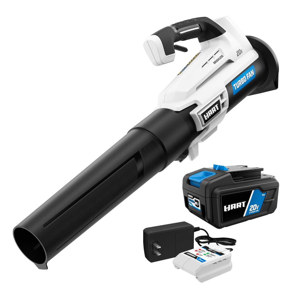 Seize this Limited-Time Offer while it lasts! Unbelievable savings on this bundle, now $108 off! Upgrade your yard work game by ditching the garden rake and opting for the NEW HART 20-Volt 350 CFM Brushless Blower with 4.0Ah Lithium-Ion Battery and Charger Bundle. This cordless powerhouse features a brushless motor and innovative turbo fan design that doubles the clearing power, delivering a whopping 350 CFM and 110 MPH for superior debris removal. Whether you're tackling large yards or fine-tuning details, the variable speed trigger grants you precision and control. Plus, the brushless motor ensures efficiency, longer runtime, and an extended lifespan. Say goodbye to your old tools and hello to a more powerful solution! The HART 20V 350 CFM Brushless Blower and 4.0Ah Lithium-Ion Battery are both covered by a limited 3-year warranty. Includes: (1) 20V Turbo Fan Blower, (1) 20V 4.0Ah Lithium-Ion Battery, (1) 20V Fast Charger, (1) Blower Tube, and (1) Operator's Manual.