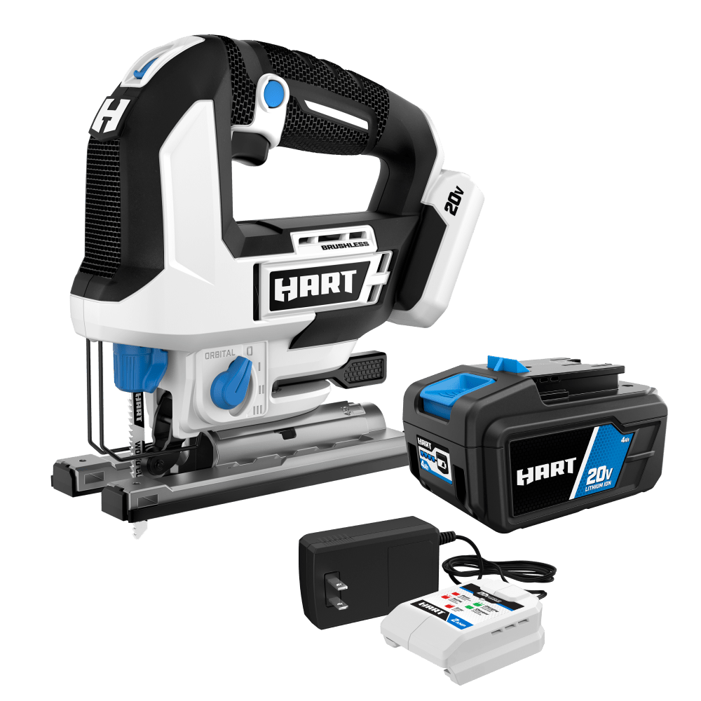 Seize this Limited-Time Offer while it lasts! Unbelievable savings on this bundle, now $108 off! If you’re a beginning woodworker or a DIY warrior, this HART 20-Volt Brushless Orbital Jigsaw with 4.0Ah Lithium-Ion Battery and Charger is a must-have. This jigsaw is a powerhouse with a blistering 800-3,350 SPM and a stroke length of 1 inch. It’ll definitely cut through anything you throw at it. And because it’s brushless, you can expect up to 58% longer runtime and up to 36% faster cutting speeds when compared to HART’s brushed counterpart**. It features 4-position orbital settings for increased versatility. The orbital action tears through wood with a 0-45º bevel cut that bevels left and right. To change the bevel, open the level and decide which angle you want to cut. No extra tools are needed. The orbital can also be turned off to make straight cuts. The major features are a lock-on switch for uninterrupted cutting, an onboard LED light to illuminate the workspace, and a non-marring shoe to protect delicate work surfaces. Includes: (1) 20V Brushless Orbital Jigsaw, (1) 20V 4.0Ah Lithium-Ion Battery, (1) 20V Fast Charger, (1) T-shank Wood Cutting Blade, (1) Non-Marring Shoe, and (1) Operator's Manual.