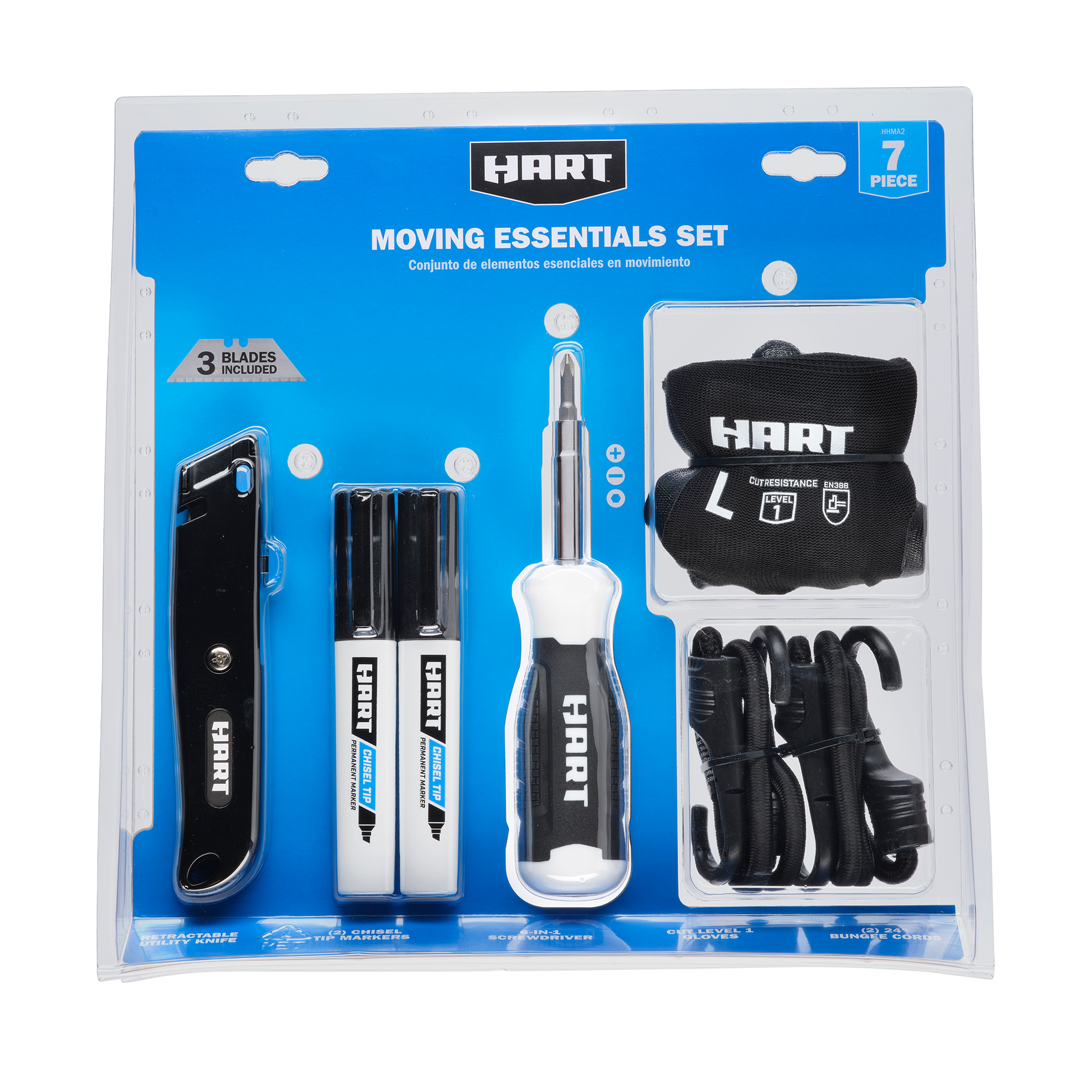 Make sure your next move is a smooth one with this essential moving set from HART. The set includes a retractable utility knife for quick and easy blade changes, (3) blades, (2) chisel tip markers for writing on dusty, wet, or oily surfaces, a 6-in-1 screwdriver for fast bit changes, (2) Phillips bits, (2) Slotted bits, (2) Nut Driver bits, cut level 1 gloves, and (2) 24" bungee cords. Everything you need to make your move a breeze!
